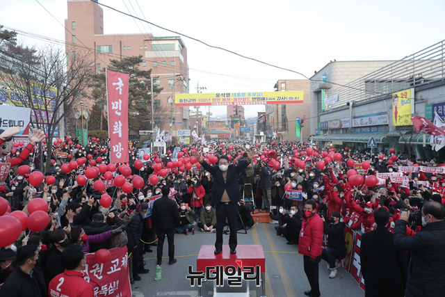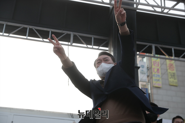 강원지역을 방문중인 윤석열 국민의힘 대선후보가 28일 오후 강원 홍천구 꽃뫼공원에서 열린 유세에서 손을 들어 지지자들에게 화답하고 있다. (사진=윤석열 캠프)