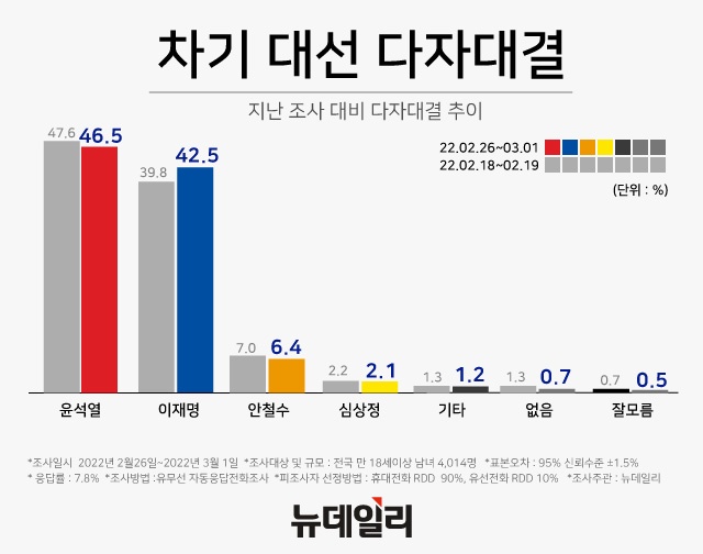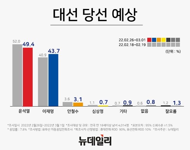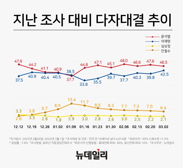 신년 이후 오름세를 보이던 윤 후보는 대선 일주일을 앞두고 공표된 이번 조사에서는 하락세였다. 다자대결 추이를 보면, 윤 후보는 지난해 12월 47.9%를 기록(2021년 12월12일)한 뒤 내림세를 유지하다 지난 1월9일(37.7%) 이후 40%대 지지율을 기록했다.이후 윤 후보는 지난 1월16일 11%p(이재명 33.8%, 윤석열 44.8%), 1월23일 11.6%p(이재명 35.5%, 윤석열 47.1%) 등 10%p 이상 격차로 이 후보를 앞섰다. 그러나 1월30일 5.4%p(이재명 39.7%, 윤석열 45.1%), 2월13일 6.3%p(이재명 40.3%, 윤석열 46.6%) 등 1월 말 이후 이 후보와 지지율 격차가 한 자릿수로 좁혀졌다.
