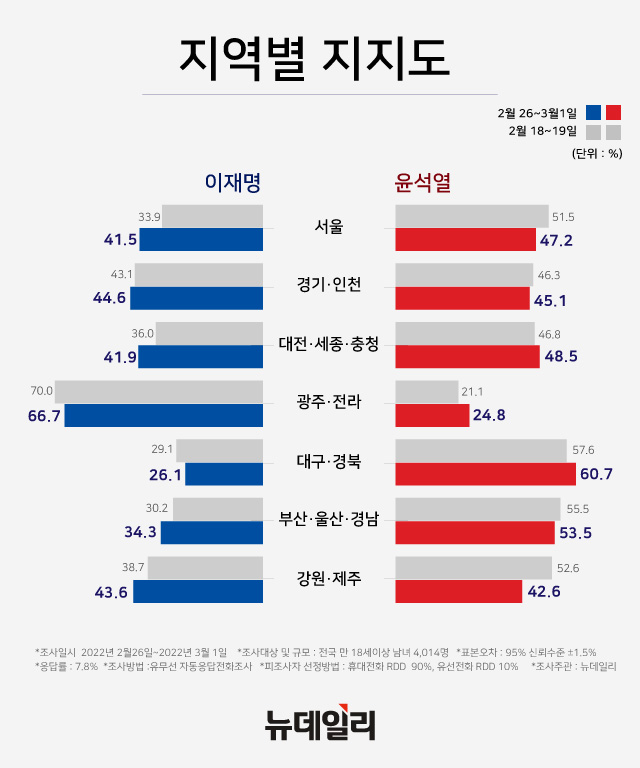 이번 조사의 지역별 지지도는 ▲서울 이재명 41.5%, 윤석열 47.2% ▲경기·인천 이재명 44.6%, 윤석열 45.1% ▲대전·세종·충청 이재명 41.9%, 윤석열 48.5% ▲광주·전라 이재명 66.7%, 윤석열 24.8% ▲대구·경북 이재명 26.1%, 윤석열 60.7% ▲부산·울산·경남 이재명 34.3%, 윤석열 53.5% ▲강원·제주 이재명 43.6%, 윤석열 42.6% 등이었다. -