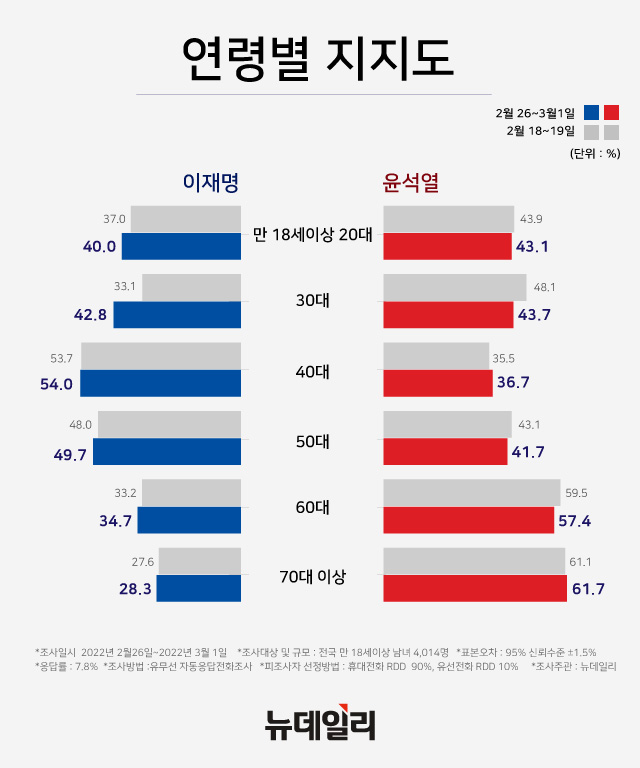 이번 조사의 연령별 지지도는 ▲만 18세 이상 20대 이재명 40%, 윤석열 43.1% ▲30대 이재명 42.8%, 윤석열 43.7% ▲40대 이재명 54%, 윤석열 36.7% ▲50대 이재명 49.7%, 윤석열 41.7% ▲60대 이재명 34.7%, 윤석열 57.4% ▲70대 이상 이재명 28.3%, 윤석열 61.7% 등으로 집계됐다. -