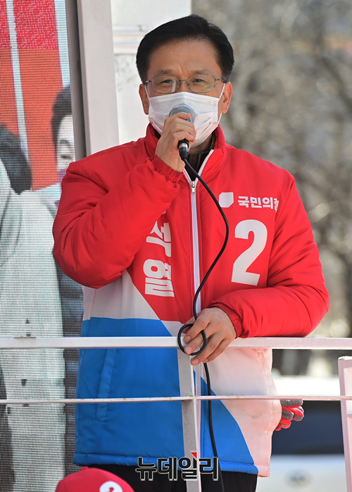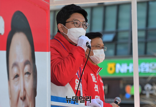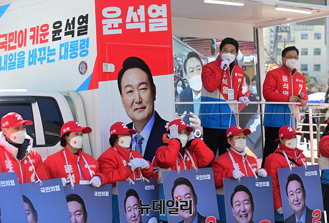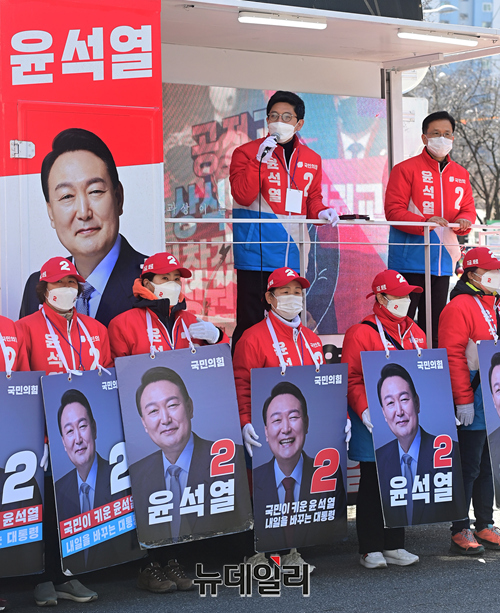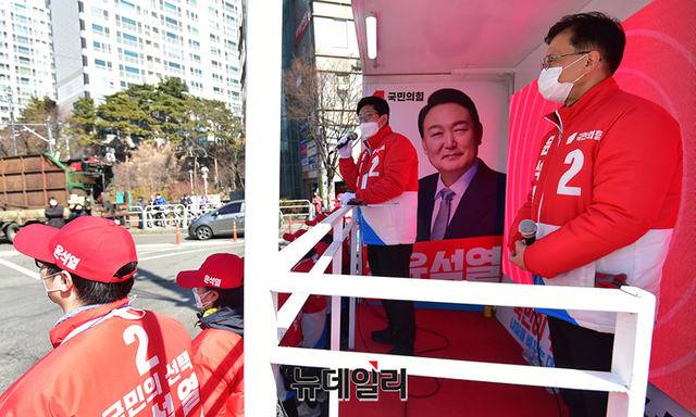 국민의힘 대변인 김병민 광진갑 당협위원장과 한상학 성북갑 당협위원장이 2일 오후 서울 성북구 길음시장 거리에서 윤석열 대선후보의 지원 유세를 이어가고 있다.