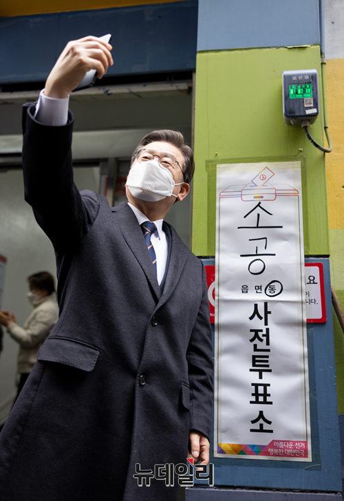 이재명 더불어민주당 대선 후보가 4일 오전 서울 중구 소공동 주민센터에서 제20대 대통령선거 사전투표를 마치고 투표 인증샷을 찍고 있다. (사진=이재명 캠프)