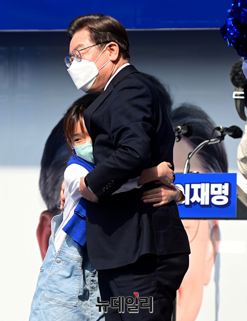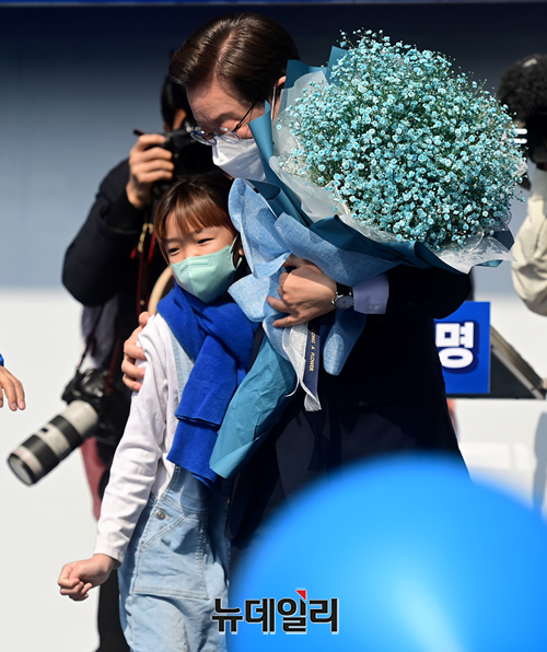 이재명 더불어민주당 대선후보가 사전투표가 시작된 4일 정오 강원 홍천군 홍천중앙시장 입구에서 열린 유세에서 어린이에게 꽃다발을 받고 있다. (강원 홍천=정상윤 기자)