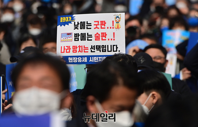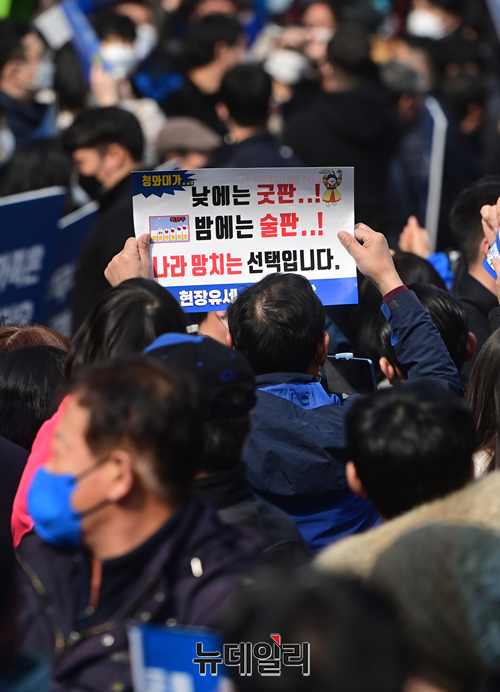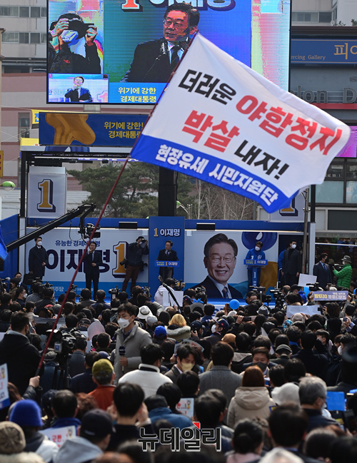 이재명 더불어민주당 대선후보가 사전투표가 시작된 4일 오후 강원 춘천시 중앙로에서 열린 집중유세에서 지지자들이 윤석열, 안철수 후보의 단일화를 규탄하는 깃발을 들고 있다. (강원 춘천=정상윤 기자)