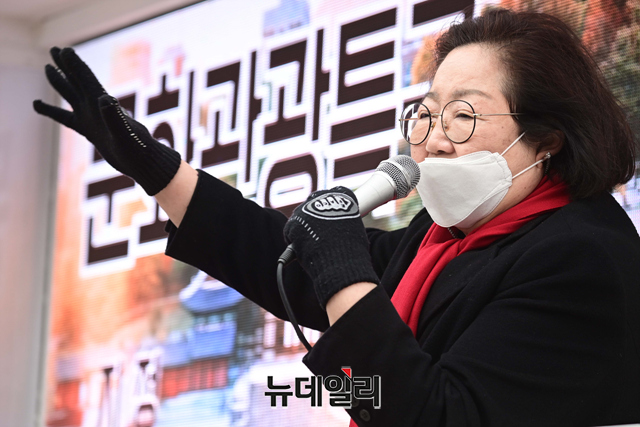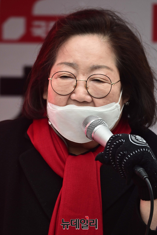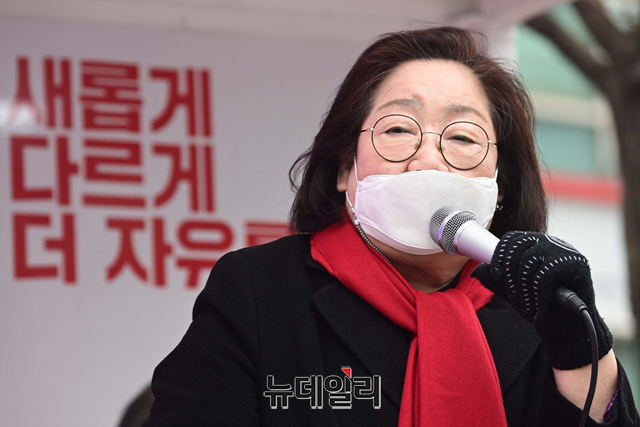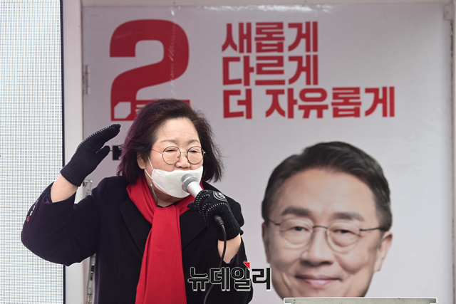 김좌진 장군의 손녀 김을동 전 국회의원이 4일 오후 서울 종로구 동묘앞역 인근에서 열린 최재형 국민의힘 종로 보궐선거 후보의 유세에서 지지를 호소하고 있다.