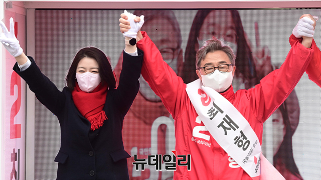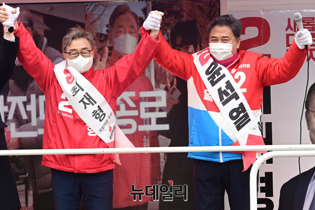 최재형 국민의힘 종로구 보궐선거 후보와 배현진 국민의힘 의원, 박진 의원이 4일 오후 서울 종로구 동묘앞역 인근에서 열린 유세에서 지지호소를 하고 있다.