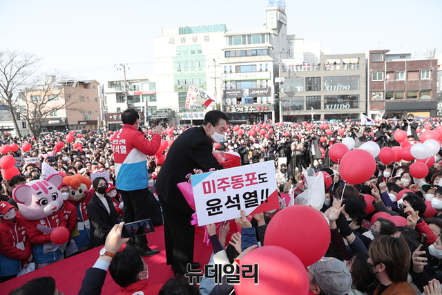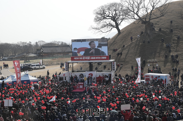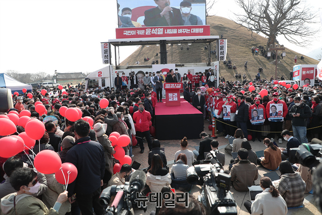 윤석열 국민의힘 대선후보가 사전투표가 시작된 4일 오후 경북 경주시 봉황대 광장에서 열린 유세에서 지지호소를 하고 있다. (사진=윤석열 캠프)
