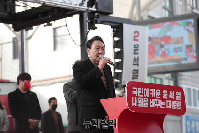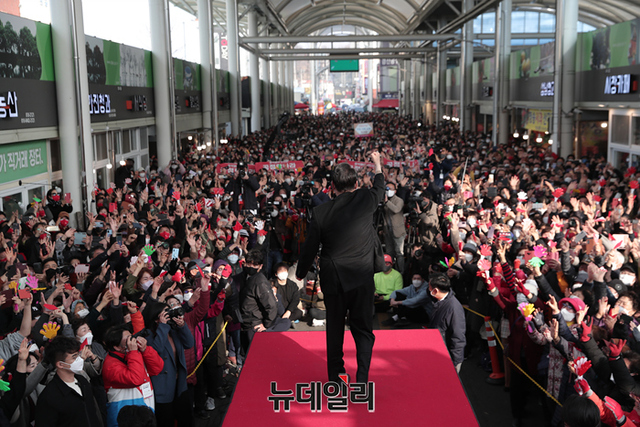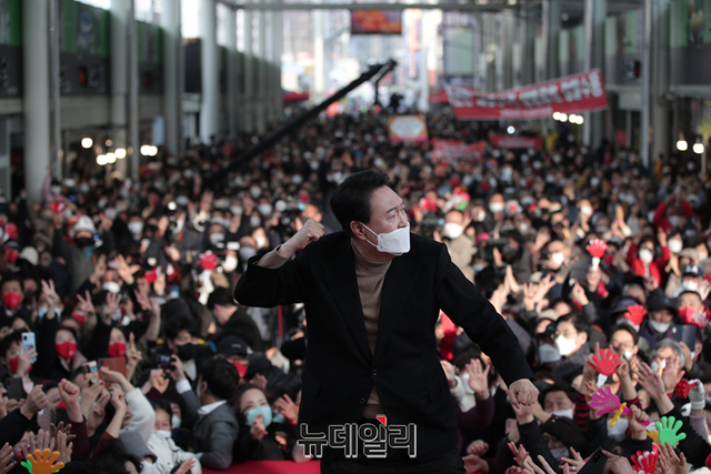 윤석열 국민의힘 대선후보가 사전투표가 시작된 4일 오후 경북 경산시 경산공설시장에서 열린 유세에서 어퍼컷 세리모니를 하고 있다. (사진=윤석열 캠프)