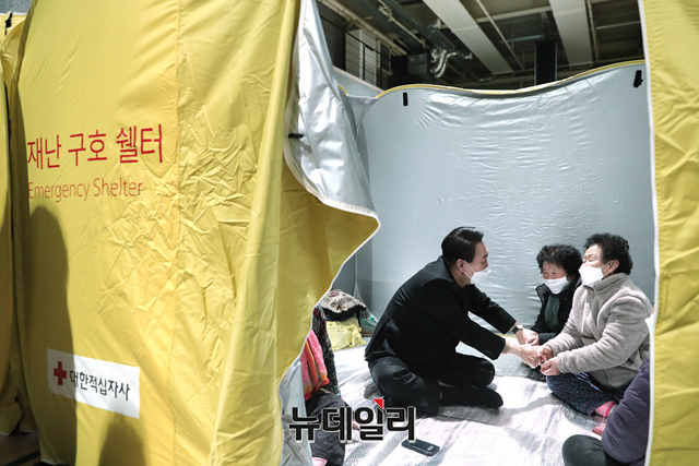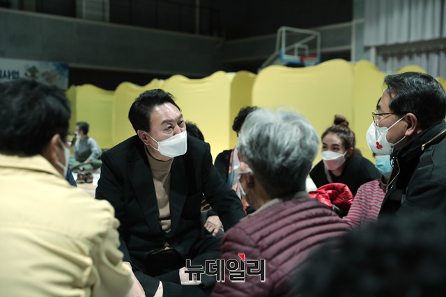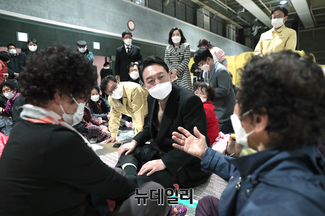 윤석열 국민의힘 대선후보가 4일 경북 울진군 울진국민체육센터에 마련된 이재민 보호소를 방문해 산불에 대피한 주민들을 위로하고 있다.