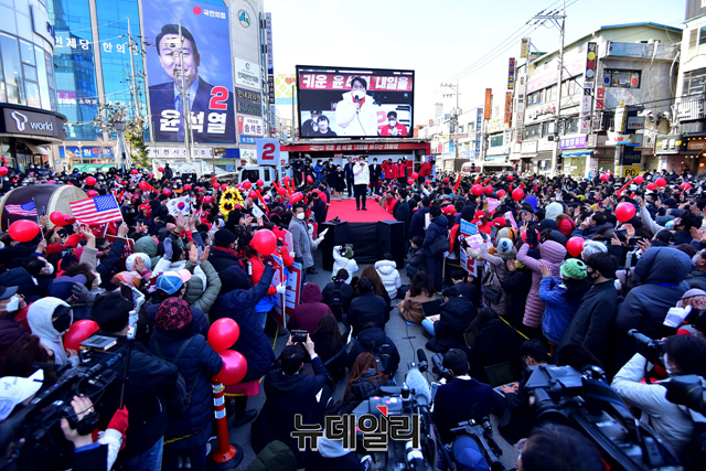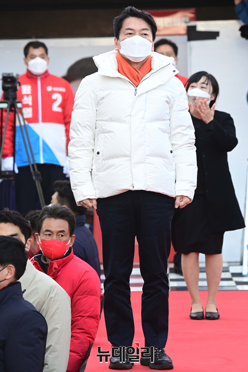 안철수 국민의당 대표가 5일 오후 경기 이천시 이천시산림조합 앞에서 열린 윤석열 국민의힘 대선후보의 유세에 처음으로 등장해 윤 후보에 대한 지지를 호소하고 있다. (경기 이천=강민석 기자)