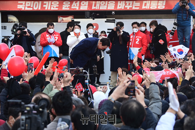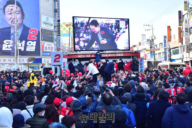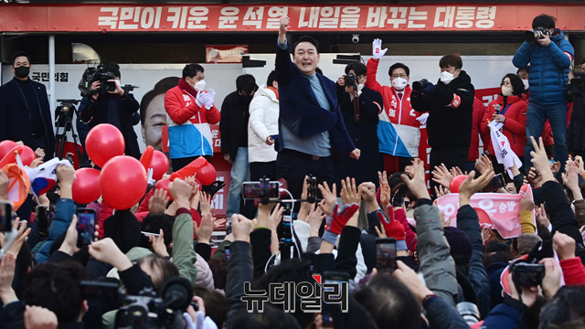 윤석열 국민의힘 대선후보가 5일 오후 경기 이천시 이천시산림조합 앞에서 열린 유세에서 지지를 호소하며 어퍼컷을 하고 있다. (경기 이천=강민석 기자)