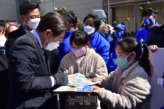 이재명 더불어민주당 대선후보가 5일 오후 경기 하남시 스타필드에서 열린 유세에서 어린이들에게 사인을 해주고 있다. (경기 하남=강민석 기자)