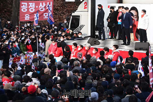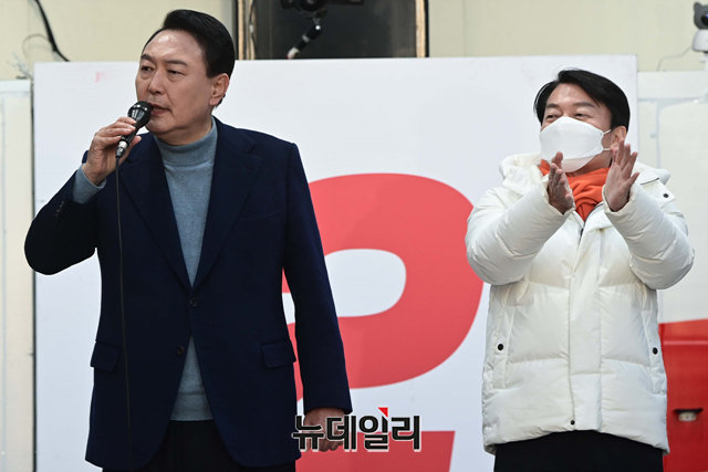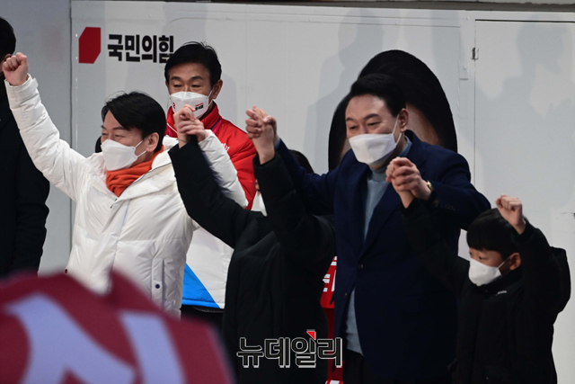 윤석열 국민의힘 대선후보와 안철수 국민의당 대표가 5일 오후 서울 광진구 아차산역 인근에서 열린 유세에서 지지호소를 하고 있다.