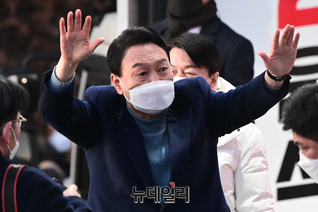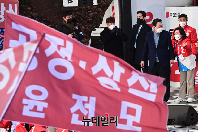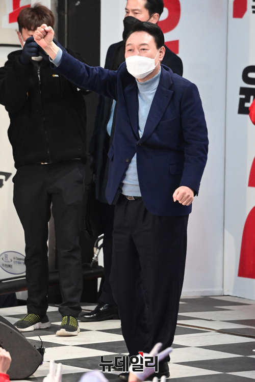 윤석열 국민의힘 대선후보가 5일 오후 서울 광진구 아차산역 인근에서 열린 유세에서 어린이가 준비한 꽃다발을 받고 기념촬영을 하고 있다.