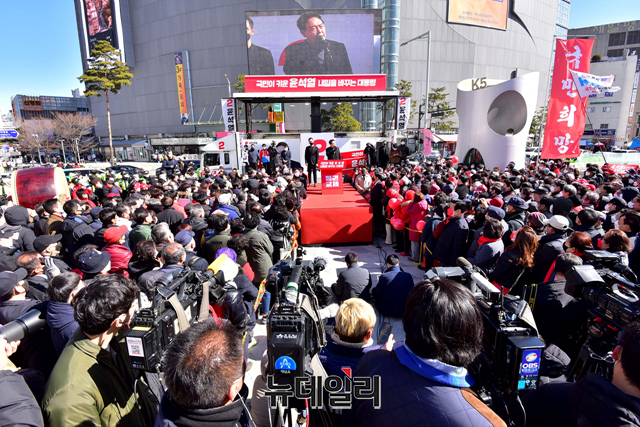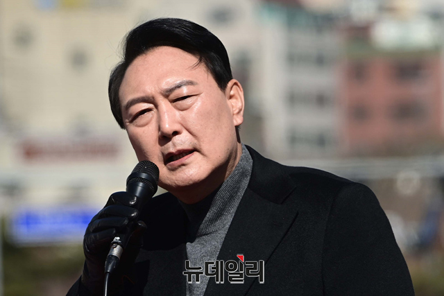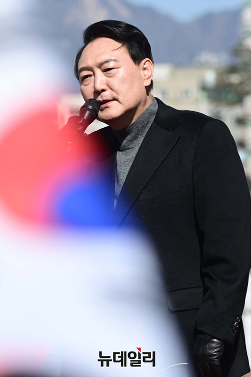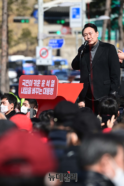 윤석열 국민의힘 대선후보가 6일 오전 서울 중구 동대문디자인플라자에서 열린 유세에서 지지호소를 하고 있다.