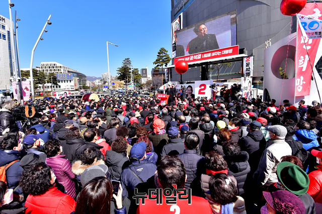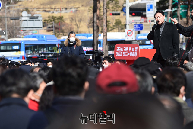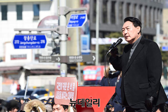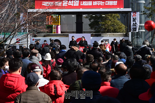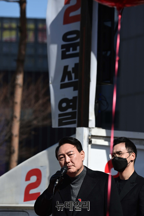 윤석열 국민의힘 대선후보가 6일 오전 서울 중구 동대문디자인플라자에서 열린 유세에서 지지호소를 하고 있다.