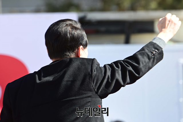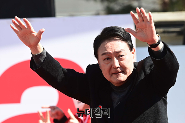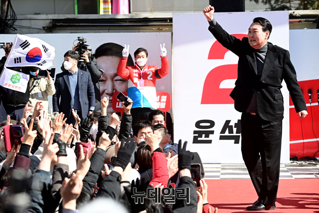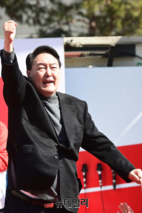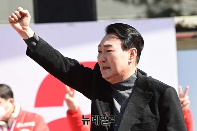 윤석열 국민의힘 대선후보가 6일 오전 서울 중구 동대문디자인플라자에서 열린 유세에서 지지호소를 하며 어퍼컷을 선보이고 있다.
