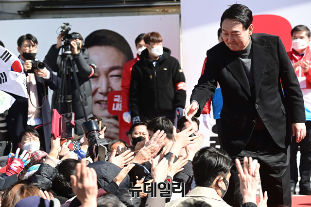 윤석열 국민의힘 대선후보가 6일 오전 서울 중구 동대문디자인플라자에서 열린 유세에서 지지호소를 마친 직후 시민들과 인사를 하고 있다.