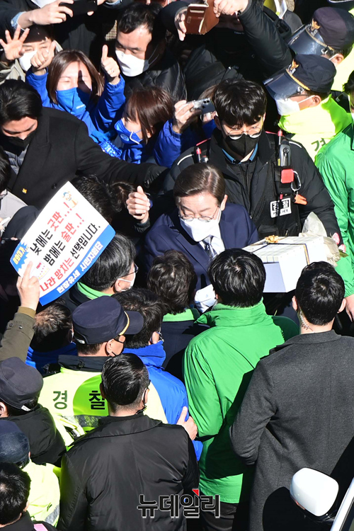 이재명 더불어민주당 대선후보가 6일 오후 서울 도봉구 도봉산 입구에서 열린 유세에서 유세를 마치고 지지자가 준비한 선물을 받고 차량으로 이동하고 있다.