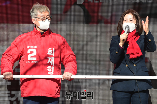 최재형 국민의힘 종로구 보궐선거 후보와 김미애 의원이 6일 오후 서울 종로구 경희궁 자이아파트 앞에서 열린 유세에서 지지호소를 하고 있다.