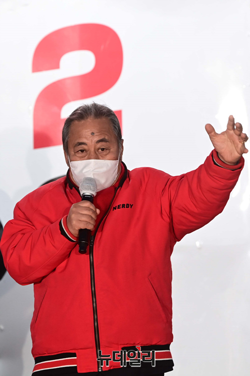 배우 정동남이 6일 오후 경기 부천역에서 열린 윤석열 국민의힘 대선후보 유세에서 지원 유세를 하고 있다. (경기 부천=강민석 기자)