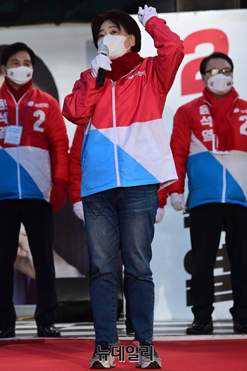 윤희숙 국민의힘 전 의원이 6일 오후 경기 부천역에서 열린 윤석열 후보의 유세에서 지지호소를 하고 있다. (경기 부천=강민석 기자)