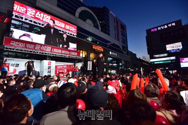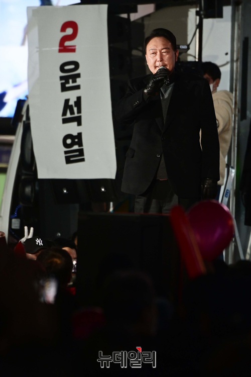 윤석열 국민의힘 대선후보가 6일 오후 경기 부천역에서 열린 유세에서 지지호소를 하고 있다. (경기 부천=강민석 기자)