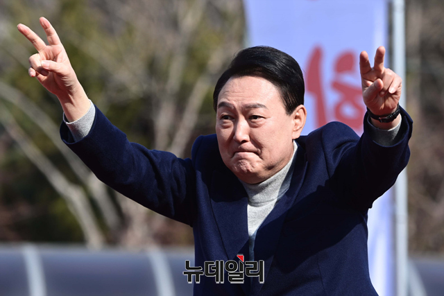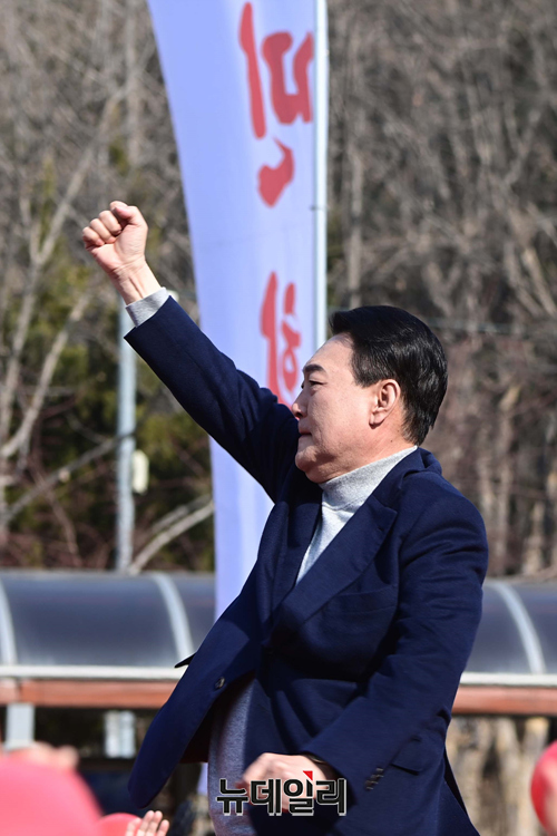 윤석열 국민의힘 대선후보가 7일 오전 경기 구리역에서 열린 유세에서 어퍼컷 세리모니를 하고 있다. (경기 구리=강민석 기자)