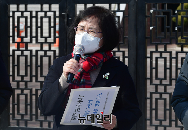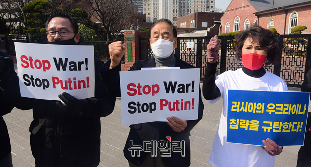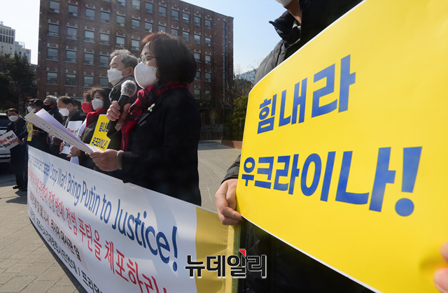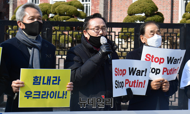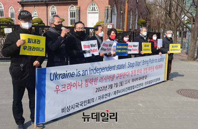 이재오 비상시국국민회의 상임의장, 이희범 자유연대 상임대표, 전민정 제주4·3사건재정립시민연대 대표, 프리덤칼리지장학회 회원들이 7일 오전 서울 중구 주한러시아 대사관 앞에서 러시아의 우크라이나 침략을 규탄하는 기자회견을 갖고 있다.이후 이들은 우크라이나 대사관으로 자리를 옮겨 '우크라이나 응원과 위로' 기자회견을 갖고 성금을 전달 할 예정이다.