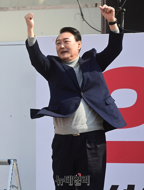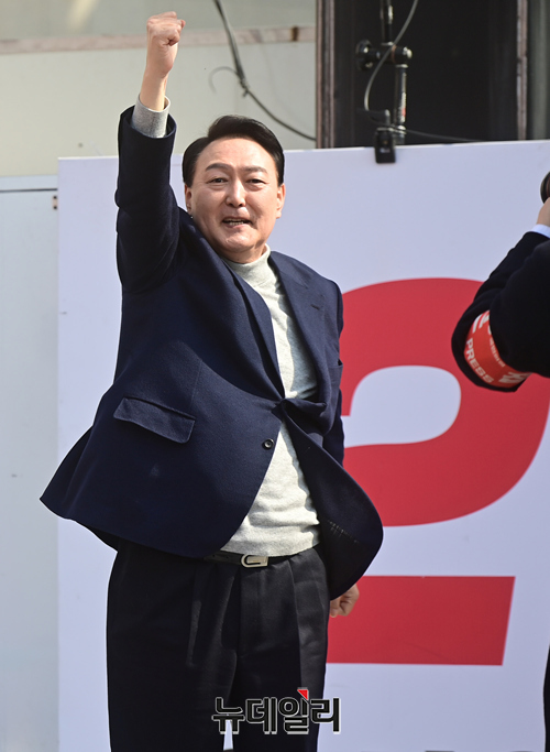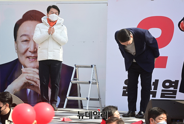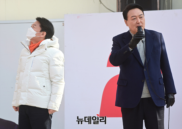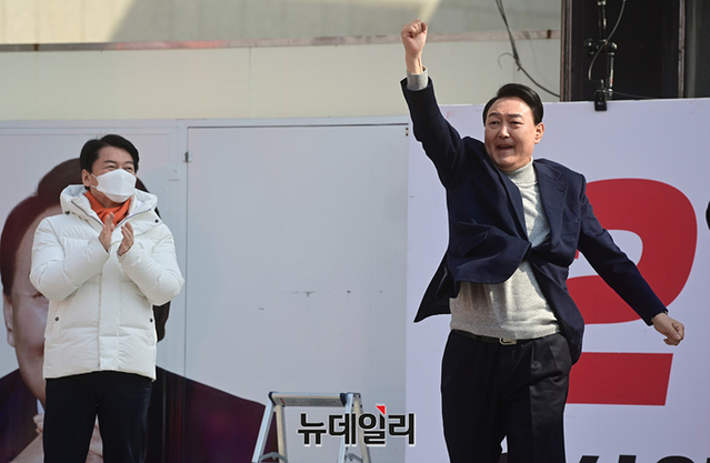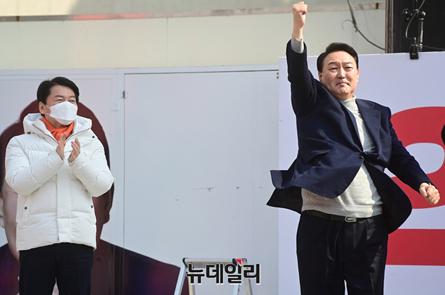 윤석열 국민의힘 대선후보가 7일 오전 경기 하남시 스타필드 하남 광장에서 열린 유세에서 안철수 국민의당 대표와 함께 연단에 올라 지지호소를 하고 있다. (경기 하남=정상윤 기자)