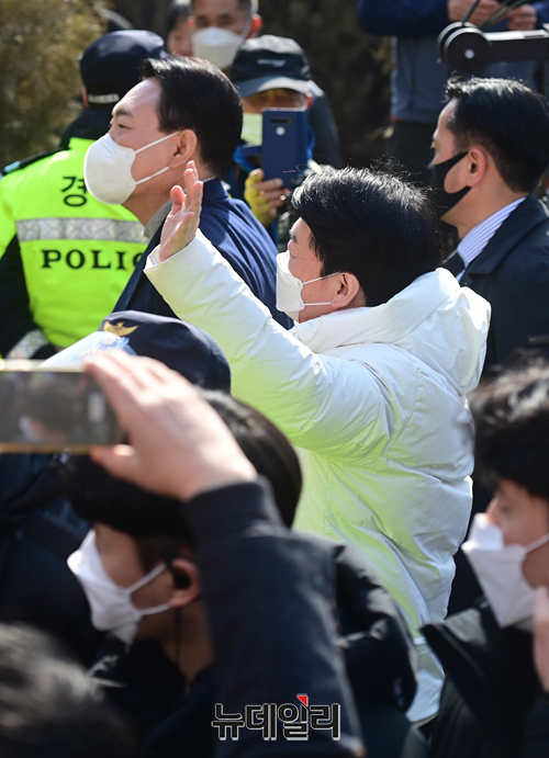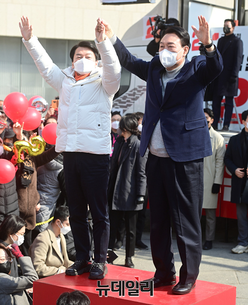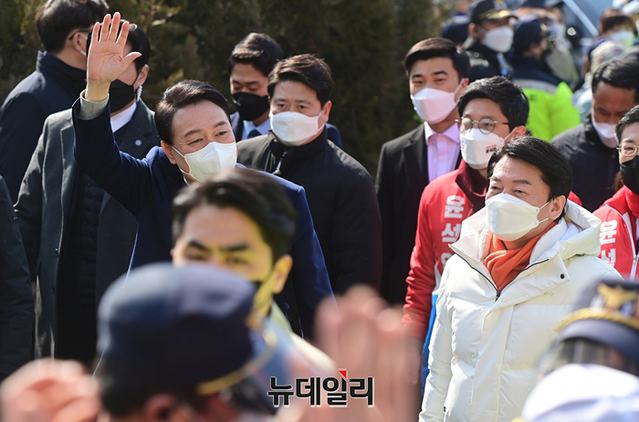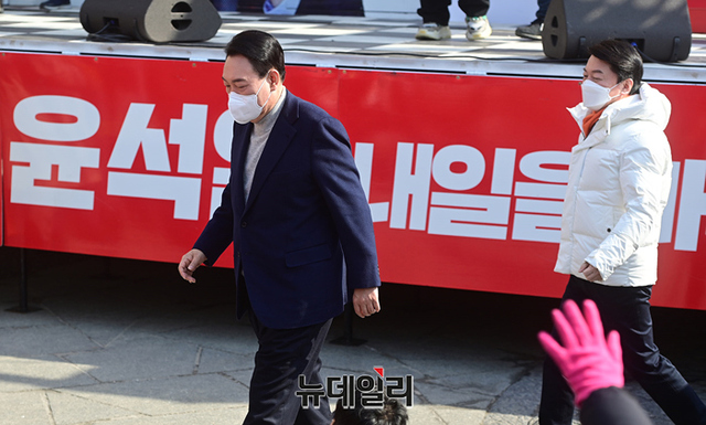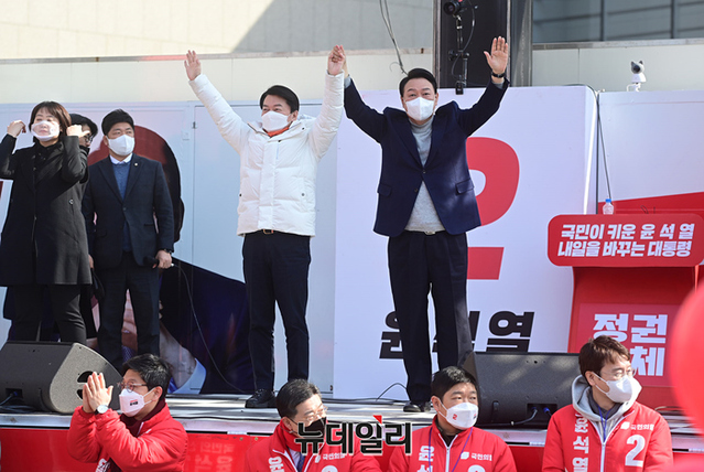 윤석열 국민의힘 대선후보와 안철수 국민의당 대표가 7일 오전 경기 하남시 스타필드 하남 광장에서 열린 유세에 동시에 입장하고 있다. (경기 하남=정상윤 기자)