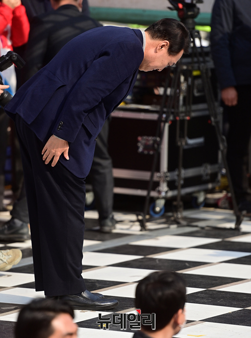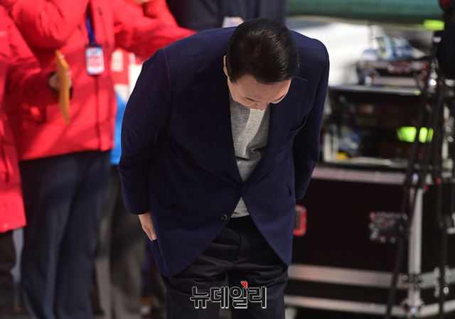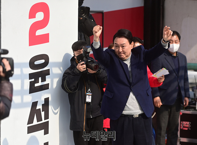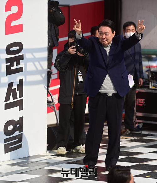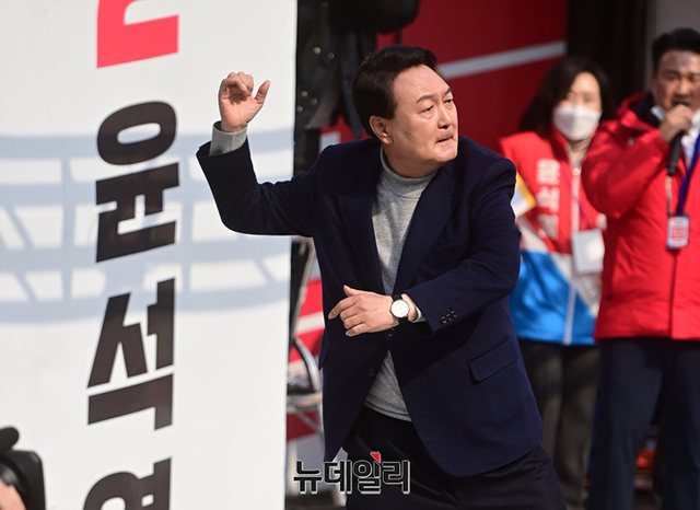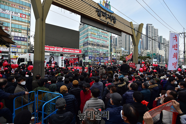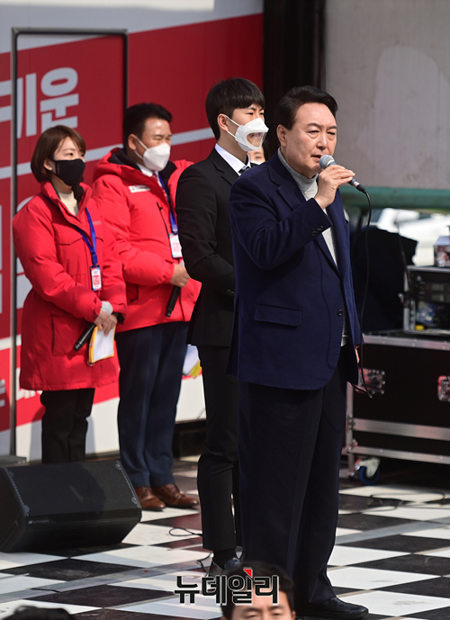 경기지역을 방문중인 윤석열 국민의힘 대선후보가 대선을 이틀 앞둔 7일 오후 경기 시흥시 삼미시장 입구에서 지지호소를 하고 있다. (경기 시흥=정상윤 기자)