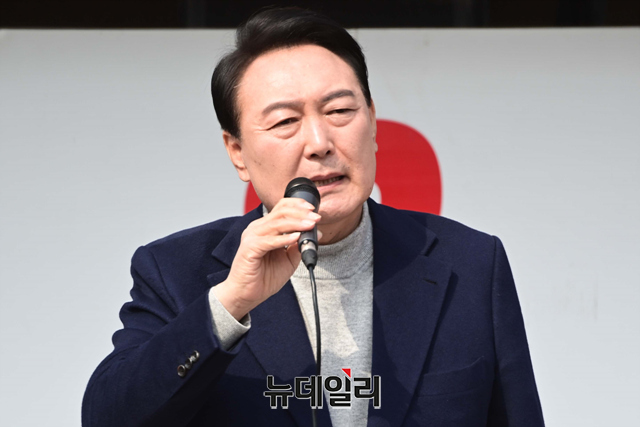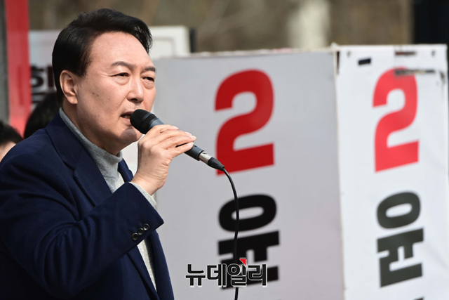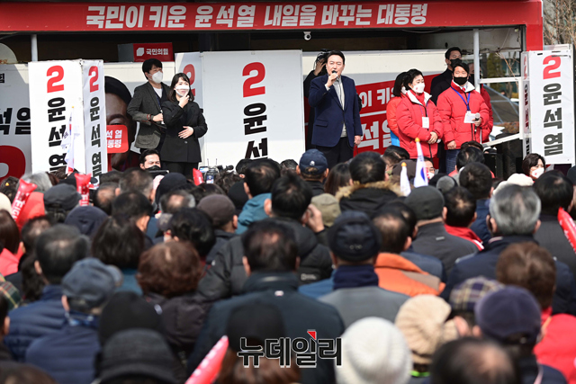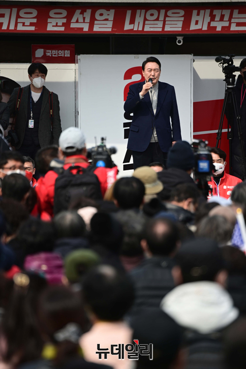 윤석열 국민의힘 대선후보가 7일 오후 경기 안양시 평촌중앙공원에서 열린 유세에서 지지를 호소 하고 있다. (경기 안양=강민석 기자)