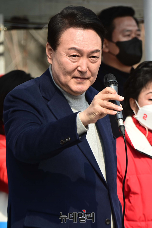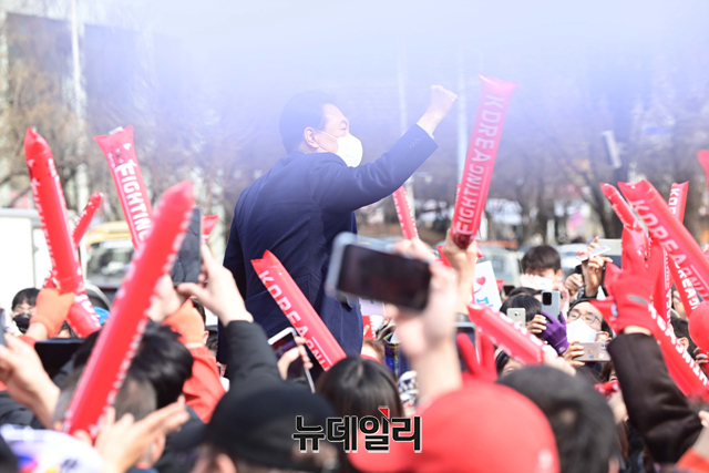 윤석열 국민의힘 대선후보가 7일 오후 경기 안양시 평촌중앙공원에서 열린 유세에서 어퍼컷 세리머니를 하고 있다. (경기 안양=강민석 기자)