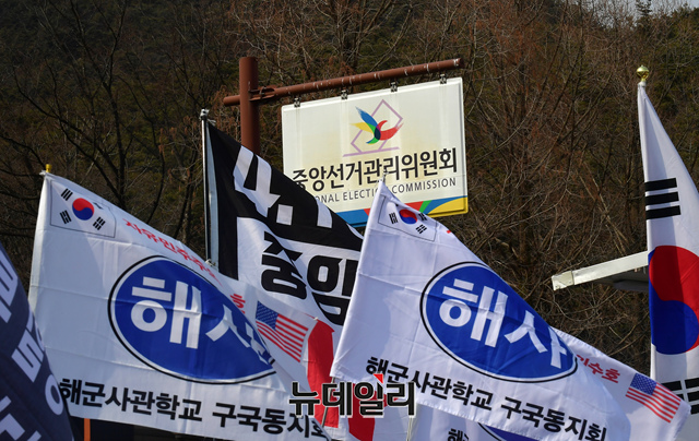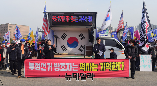 고교연합비상대책위원회가 7일 오후 경기 과천시 중앙선거관리위원회 앞에서 '국민주권 도둑질하는 선관위를 규탄한다' 집회를 갖고 있다.