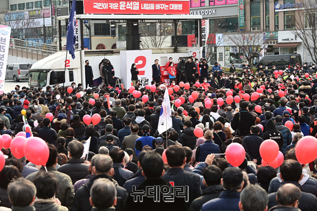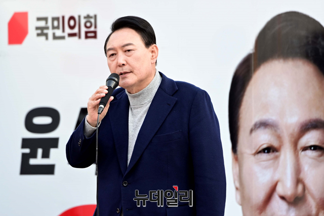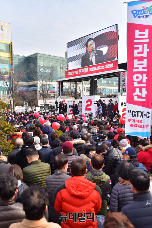윤석열 국민의힘 대선후보가 7일 오후 경기 안산시 안산문화광장에서 열린 유세에서 지지를 호소하고 있다. (경기 안산=강민석 기자)