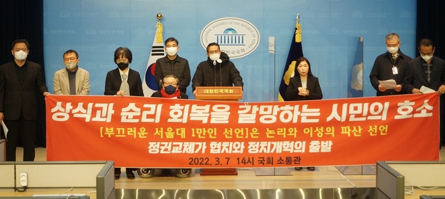 '상식과 순리 회복을 갈망하는 시민'이라고 자신들을 명명한 서울대 동문 50여 명과 여기에 동조한 고려대·연세대 동문 일부는 지난 7일 오후 국회 소통관에서 기자회견을 열고 "'부끄러운 서울대 1만인 선언(이하 '부끄러운 선언')'에 너무 큰 충격을 받았다"며 "특히 6800명의 서명자 중에 오랫동안 알고 지내던 같은 운동권 선후배와 친구들이 너무 많아서 놀랐다"고 밝혔다.