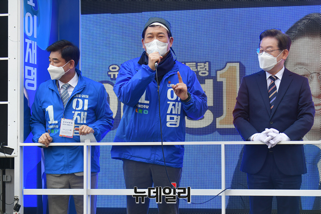이재명 더불어민주당 대선후보가 8일 오전 서울 여의도우체국 앞에서 열린 유세에서 선거운동 중 둔기 피습을 당한 송영길 대표와 함께 손을 들어 인사하고 있다.