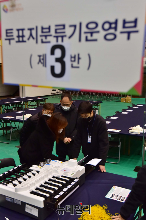 제20대 대통령선거를 하루 앞둔 8일 오후 서울 관악구 서울대학교 체육관에 마련된 개표소에서 선거관리위원회 관계자와 개표사무원들이 투표지 분류기를 최종 모의시험을 하고 있다.