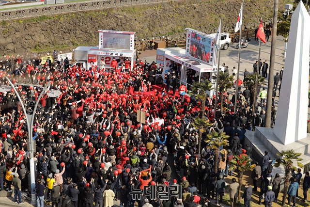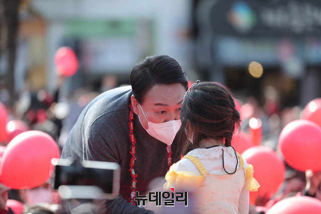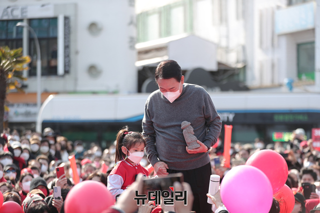 윤석열 국민의힘 대선후보가 대선 하루을 앞둔 8일 오전 제주 일도일동에서 열린 거점유세에서 선물 받은 돌하루방을 들고 있다. (사진=윤석열 캠프)