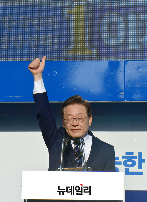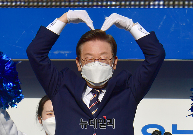 [포토] 지지자들에게 하트 만들어 보이는 이재명 후보