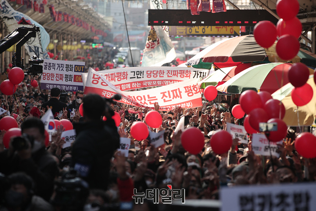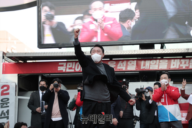 윤석열 국민의힘 대선후보가 대선 하루을 앞둔 8일 오후 대구 서문시장에서 열린 거점유세에서 어퍼컷 세리모니를 선보이며 승리를 다짐하고 있다. (사진=윤석열 캠프)