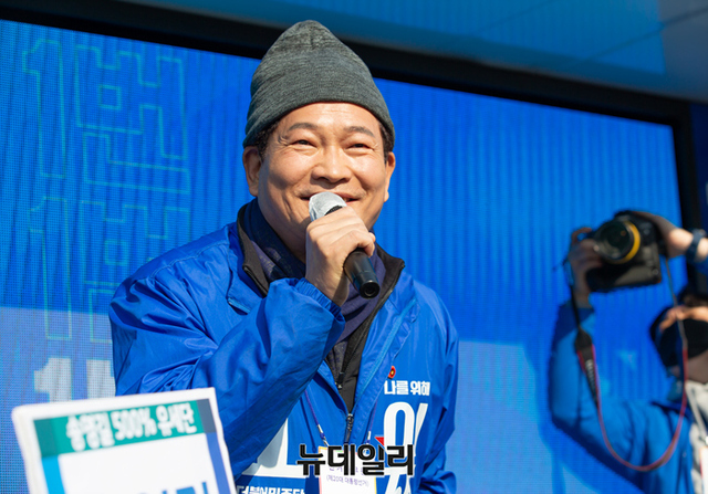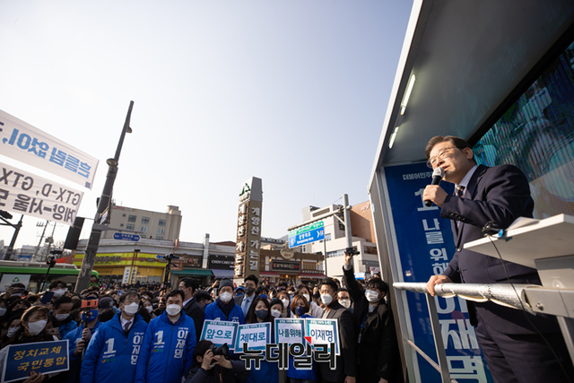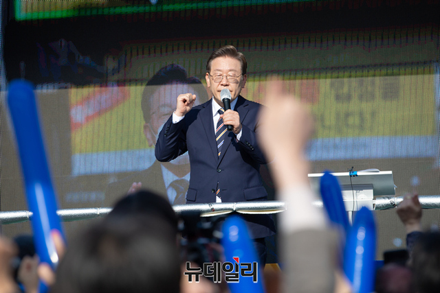 이재명 더불어민주당 대선 후보가 대선 하루을 앞둔 8일 인천 계양역에서 열린 유세에서 막판 표심잡기에 나섰다. 이날 유세엔 피습을 당한 송영길 대표가 함께했다. (사진=이재명 캠프)