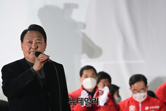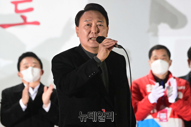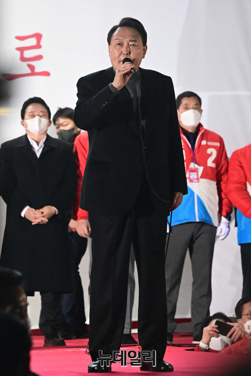 윤석열 국민의힘 대선후보가 8일 오후 서울 중구 서울시청 광장에서 열린 유세에서 지지호소를 하고 있다.