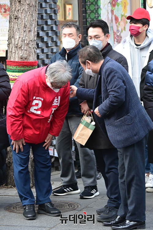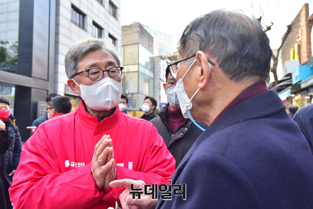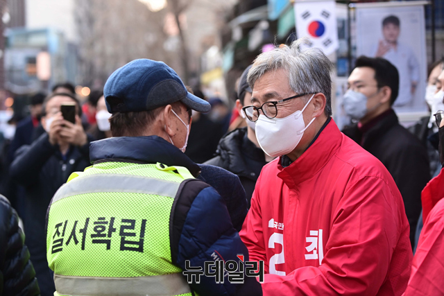 최재형 국민의힘 종로구 보궐선거 후보가 8일 오후 서울 종로구 인사동거리에서 열린 유세에서 시민들과 인사를 하고 있다.