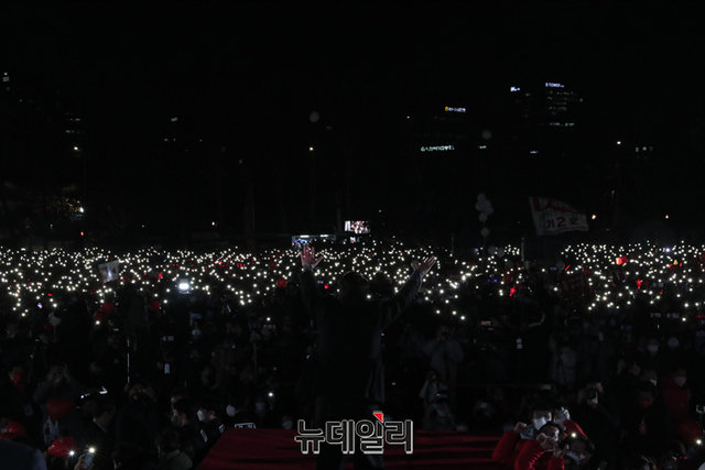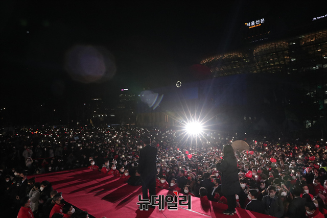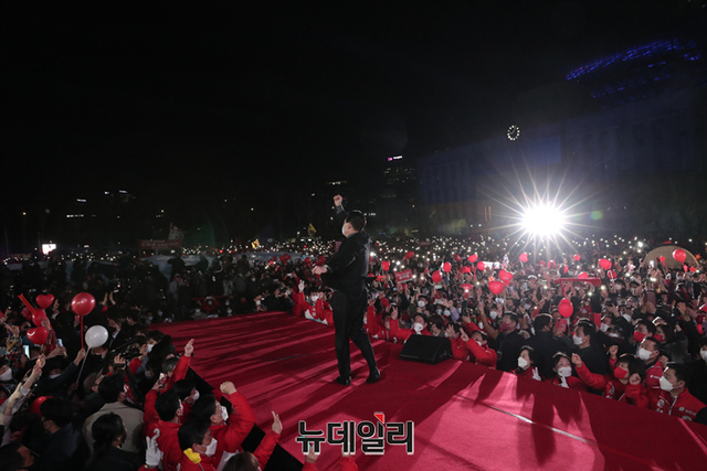 윤석열 국민의힘 대선후보가 선거를 하루 앞둔 8일 밤 서울광장에서 열린 마지막 집중유세에서 어퍼컷 세리모니를 선보이며 승리를 다짐하고 있다. 윤 후보는 강남역에서 자정까지 거리 인사를 하며 22일간의 선거운동을 마무리했다. (사진=윤석열 캠프)