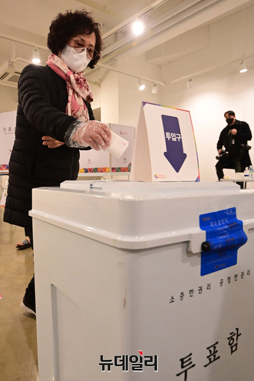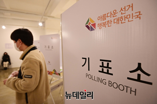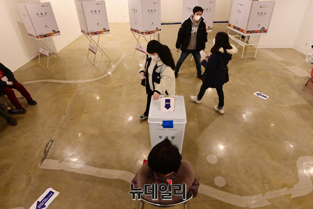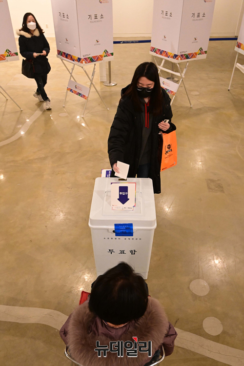 제20대 대통령선거 일인 9일 오전 서울 구로구민회관에 마련된 투표소를 찾은 유권자들이 투표를 하고 있다.선거관리위원회는 "기표소 안에서 투표지를 촬영 할 수 없고, 투표 인증샷은 투표소 입구 또는 포토존, 투표소 표지판 등을 활용해야 한다"고 말했다.코로나19 확진자와 격리자는 오후 5시 50분부터 외출이 가능하고, 일반 유권자 투표가 마친 후 오후 6시부터 7시 30분 사이에 투표를 행사 할 수 있다.이어 직접 투표함에 용지를 넣어야 된다. 투표를 마친 직후엔 격리장소로 복귀해야 한다.