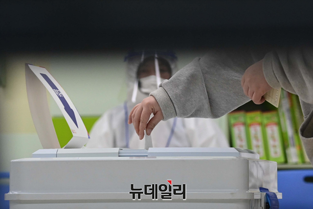 제20대 대통령 선거일인 9일 오후 서울 송파구 석촌초등학교에 마련된 투표소에서 코로나19 확진자와 자가격리 유권자가 투표를 하고 있다.