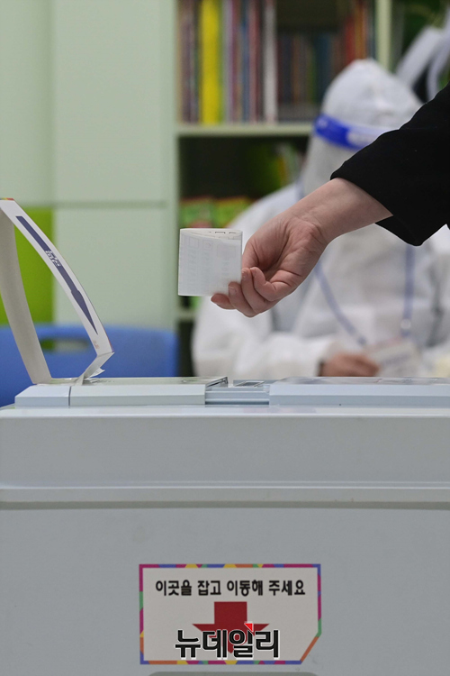 제20대 대통령선거일인 9일 오후 서울 송파구 석촌초등학교에 마련된 투표소를 찾은 코로나19 확진자와 자가격리 유권자가 투표를 하기 위해 기표소에 이동하고 있다.