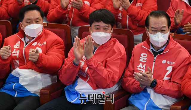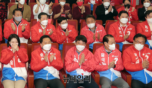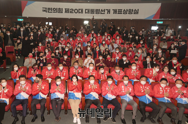 이준석 국민의힘 당대표와 권영세 총괄선대본부장, 김기현 원내대표을 비롯한 당직자들이 9일 오후 국회 도서관에 차려진 '국민의힘 제 20대 대통령선거 개표상황실'에서 방송사 출구조사 결과를 시청하며 박수를 치고 있다.